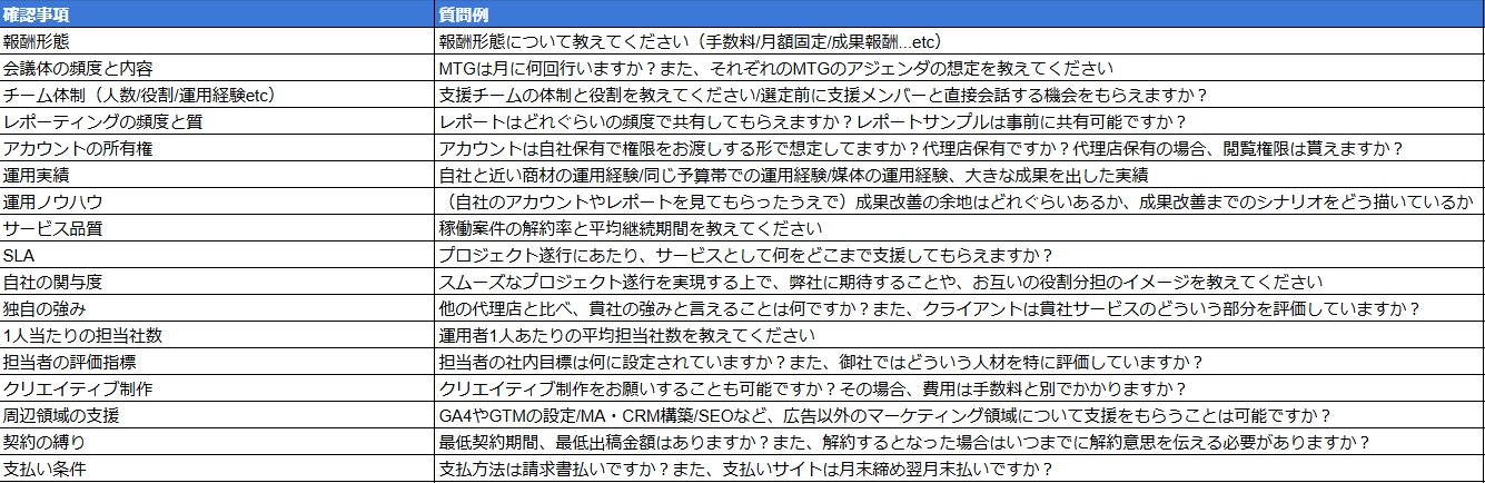 なお、営業担当と運用担当が異なる代理店もあるため、支援前に実際の運用担当者と話す機会を設けられるとベターです。