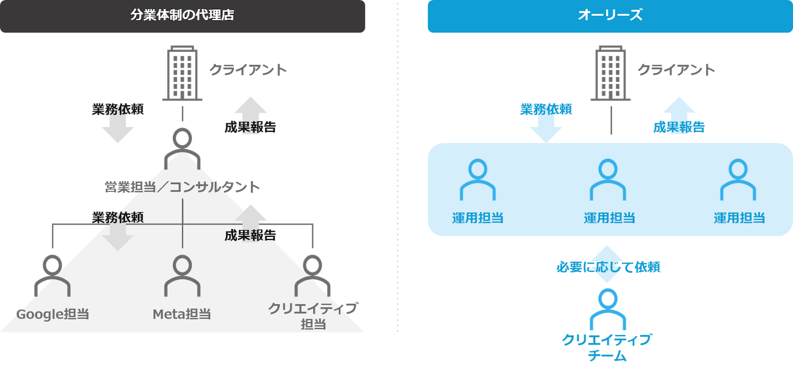私たちの組織には、営業、コンサル、運用、制作といった区分や、検索、ディスプレイ、SNSなどの媒体による区分もありません。