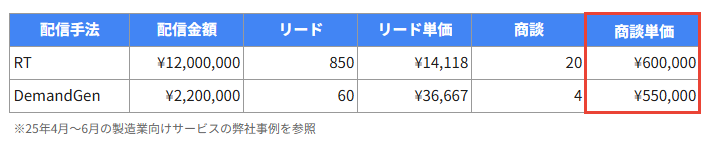 製造業向けサービスのお客様では動画素材を活用し、YouTube面を中心にDemand Genキャンペーンの配信を行いましたが、商談単価はリターゲティングとほぼ同等でした。