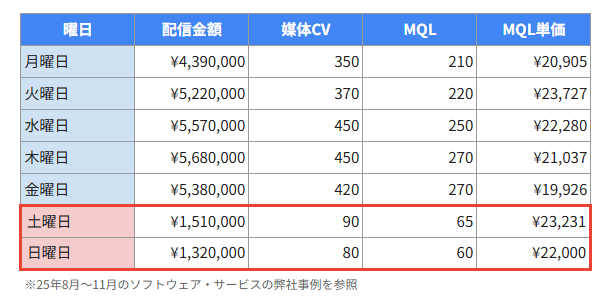 あるソフトウェアサービスの3ヶ月間のリスティング広告の成果では、配信ボリュームこそ減りますが、土日のMQLは平日と遜色ありませんでした。