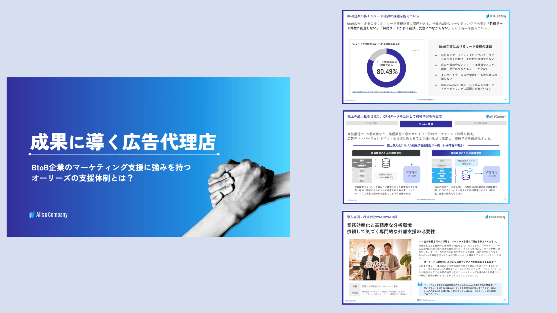 BtoB企業のマーケティング担当者の方向けに、オーリーズが提供しているBtoB向けのマーケティング支援サービスの説明資料と事例集を資料にまとめました。